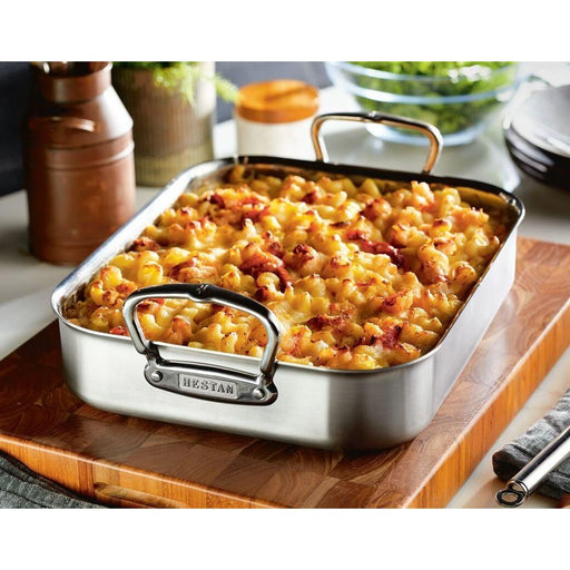 Le rôtissoire petit format robuste de Hestan, compatible induction, à construction triplement stratifiée avec grille en acier inoxydable peut conte...