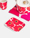 This set includes two tea towels made from a durable cotton-linen blend, featuring the iconic Unikko pattern. The fabric combines 57% organic cotton with 43% linen, offering excellent absorbency and a natural texture ideal for everyday kitchen use. The Unikko print, designed by Maija Isola, symbolizes creativity and was originally introduced in 1964 as a fresh take on floral design within Marimekko’s predominantly abstract collections.